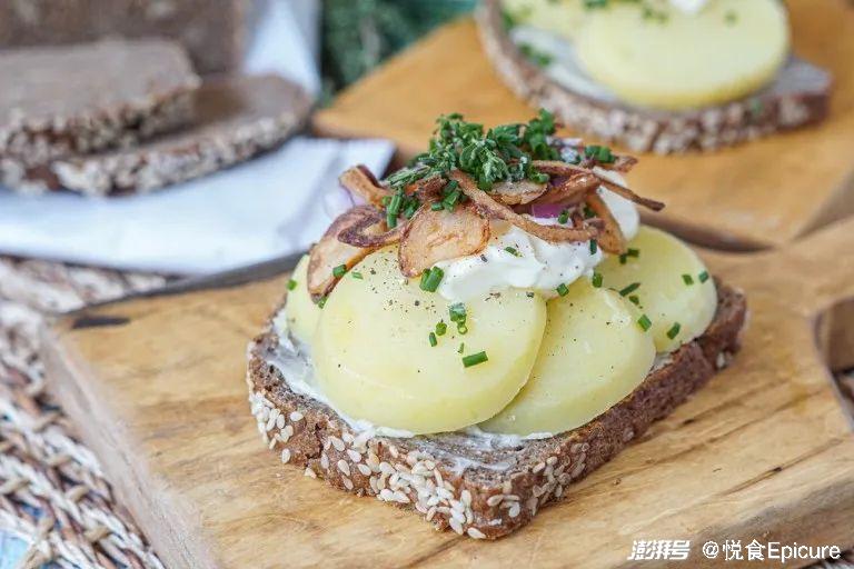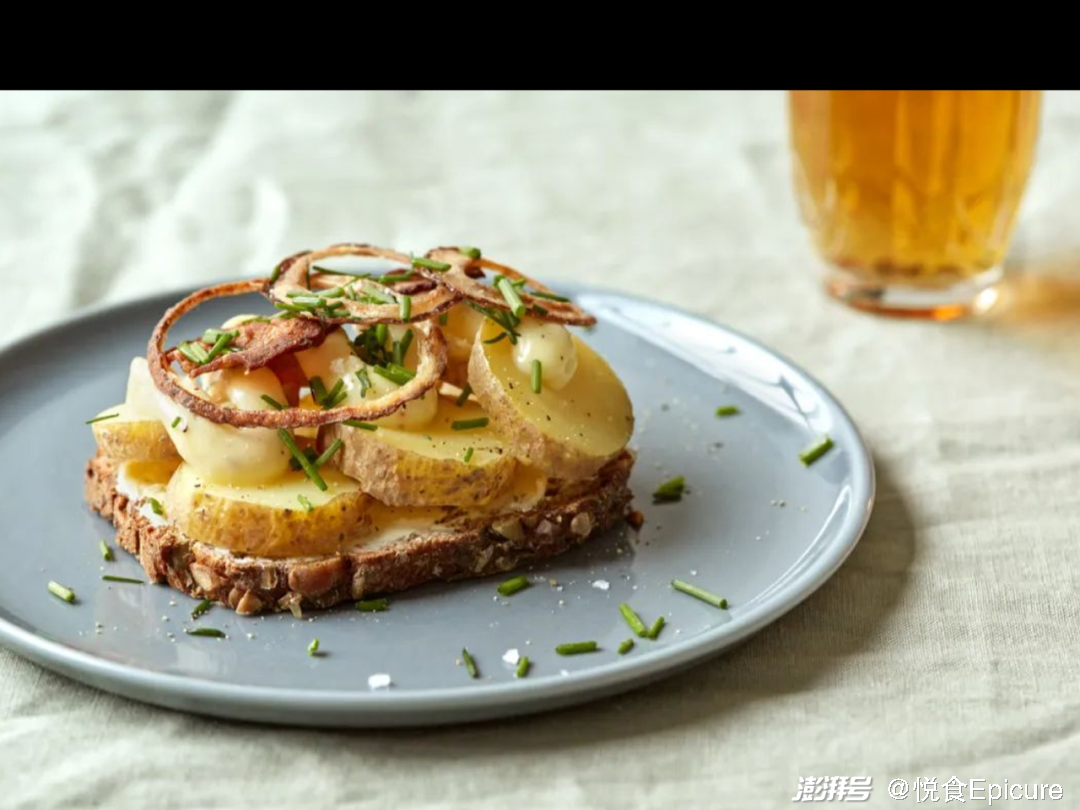 每个丹麦人都会建议你尝一尝的开放式三明治,也少不了土豆的参与。一定要用丹麦产的黑麦面包切片,涂上清爽的酸奶油,一点小葱花,小土豆盐水煮熟后切成厚片放上去,再挤上一层厚厚的蒜味蛋黄酱,最后撒上煸到酥脆的培根碎、小水萝卜薄片、芝麻菜叶等装饰。