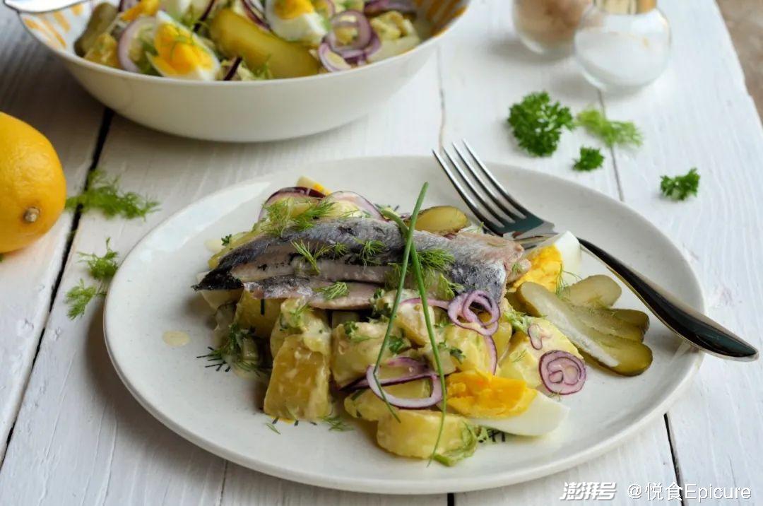 在瑞典,鲱鱼和土豆还有另一种排列组合——青鱼拌马铃薯。在新土豆上市的仲夏里,瑞典人喜欢更为简便的青鱼拌马铃薯。鲱鱼块酸渍或盐渍,土豆水煮,再浇上酸奶油,顶多再配点红洋葱或青葱,就是一道凉爽消夏的瑞典风冷菜了。也有对中国胃友好的热食,腌鲱鱼煎成鱼排,配土豆泥做成热盘。
