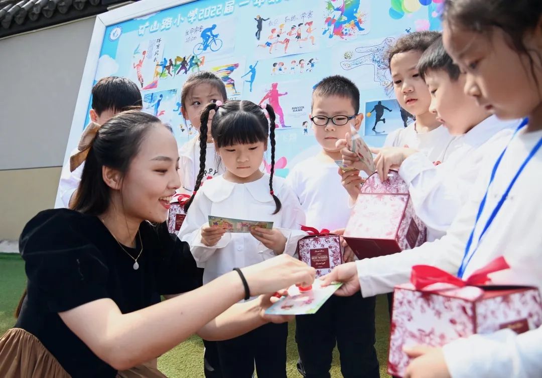 为了让一年级的小萌新们快速熟悉校园环境,矿山路小学特别准备了“校园寻宝”活动。每“打卡”一处,同学们都会获得一个盲盒,拆开里面的小纸条上写有一个问题。答对即可在藏宝图上印上奖章,集满五个后便可以到兑奖处领取学校专属定制的“矿矿山山”吉祥物。
