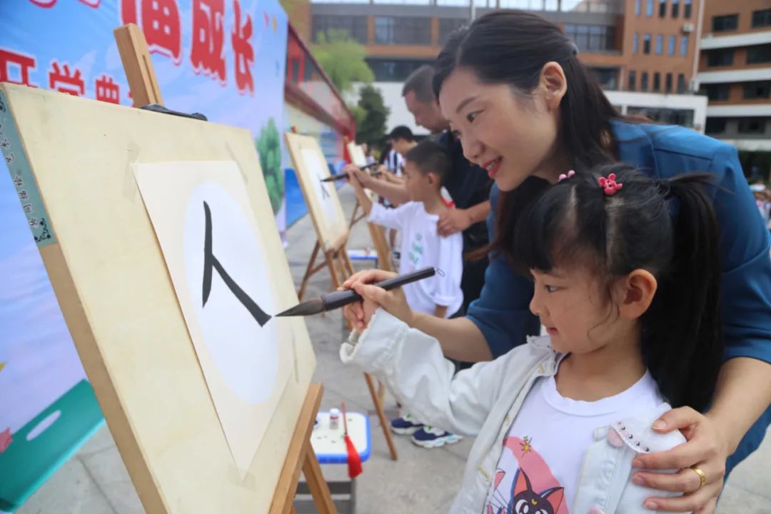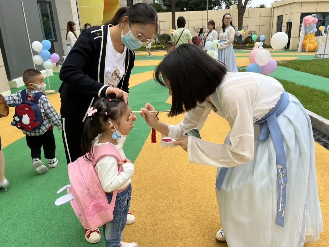 宝塔河小学老师们身着旗袍,带领一年级新生过知礼门,点朱砂痣、击明志鼓、挽发聚魄展宏图。