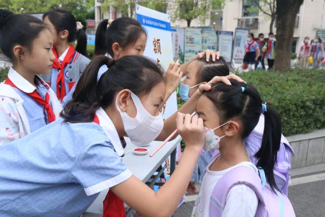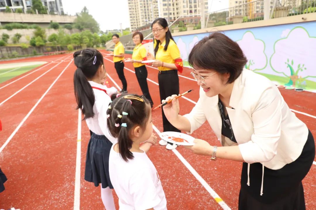 伍家岗实验小学北山校区开学典礼上,一年级新生们正在进行“朱砂启智”礼。