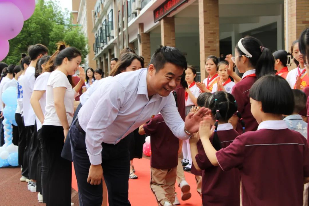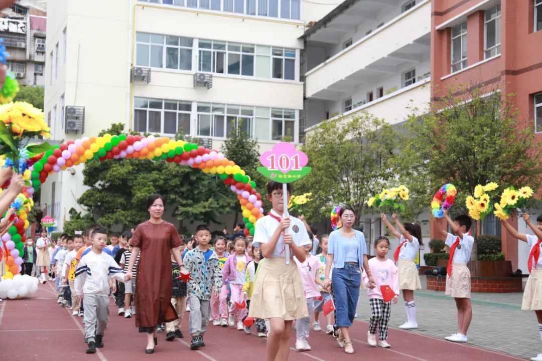 伍家岗区外国语小学举行入学礼,260名一年级新生与校长妈妈、校长爸爸走过拱门,拥抱新学期。