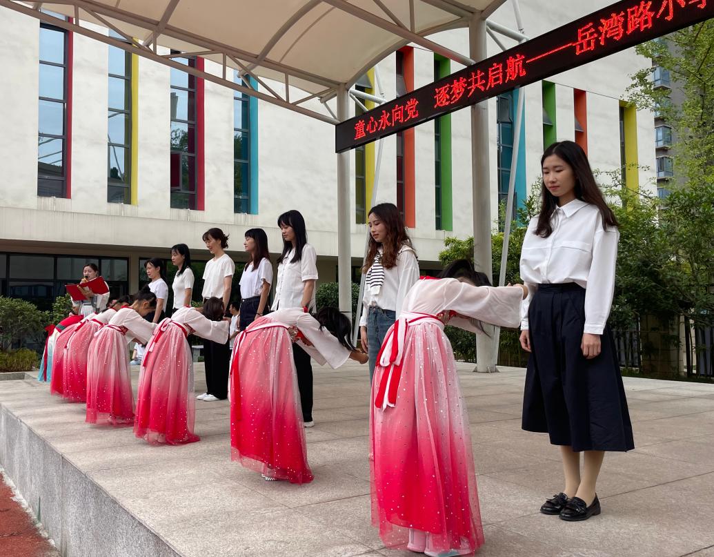 岳湾路小学开学典礼上,一年级蒙童向老师行尊师礼,在完整的开笔礼中感悟尊师、明礼重道。