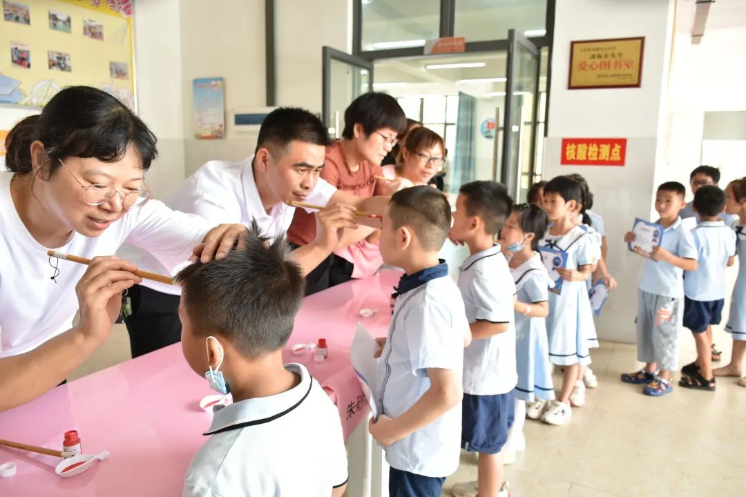 随着悠扬的广播声响起,活动拉开序幕。师生们沐浴晨光,意气风发,相聚在操场。在领取“入学通知书”后,新生们逐一走到老师的跟前,老师用毛笔蘸朱砂,在他们的额头正中轻轻点上红痣,既为“聪明记”,又称“开天眼”,让孩子们记住,用好眼睛和耳朵,专心致志,从此成为眼明、心明、好读书、读好书的聪明学童。随后,在老师的引导下,新生们仔仔细细整理“衣冠”并学习拜师礼仪,学生们面向讲台,向老师鞠躬行拜师之礼,三鞠躬感谢启蒙之恩。最后,在校长的带领下,孩子们举起右拳,庄严宣誓。稚嫩的声音亦盖不住他们充满力量的精神信念。