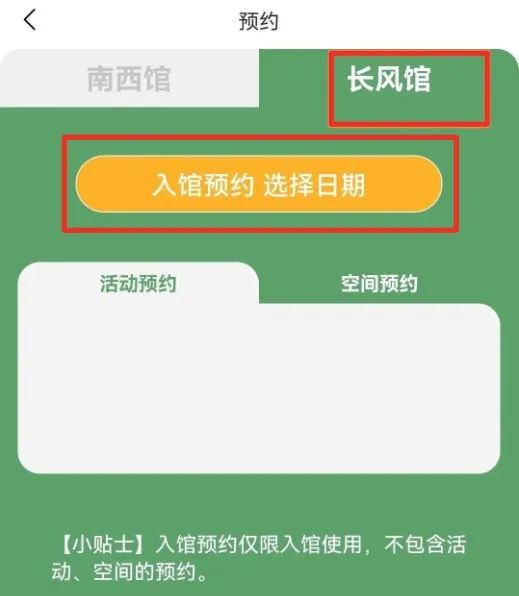 选择长风馆后,再点击黄色键“入馆预约 选择日期”;