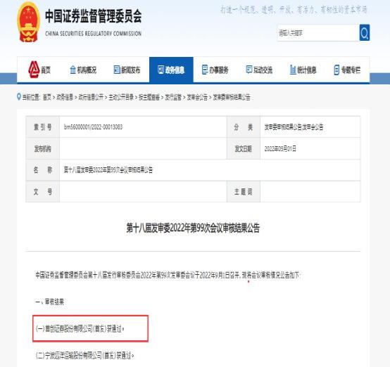 9月1日,证监会官网公布了第十八届发审委2022年第99次会议审核结果公告,首创证券股份有限公司(首发)获通过。