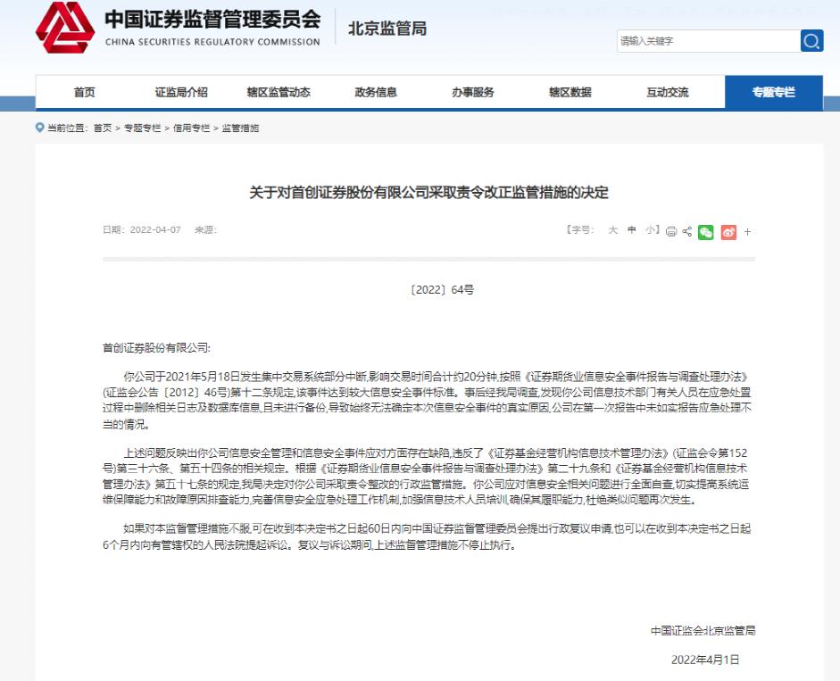 今年4月,北京证监局对首创证券采取责令改正的监督管理措施。据调查,首创证券于2021年5月18日发生集中交易系统部分中断,影响交易时间合计约20分钟,达到较大信息安全事件标准。