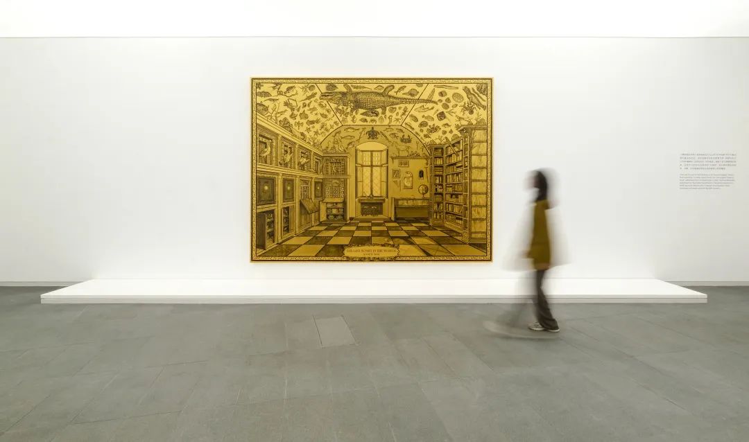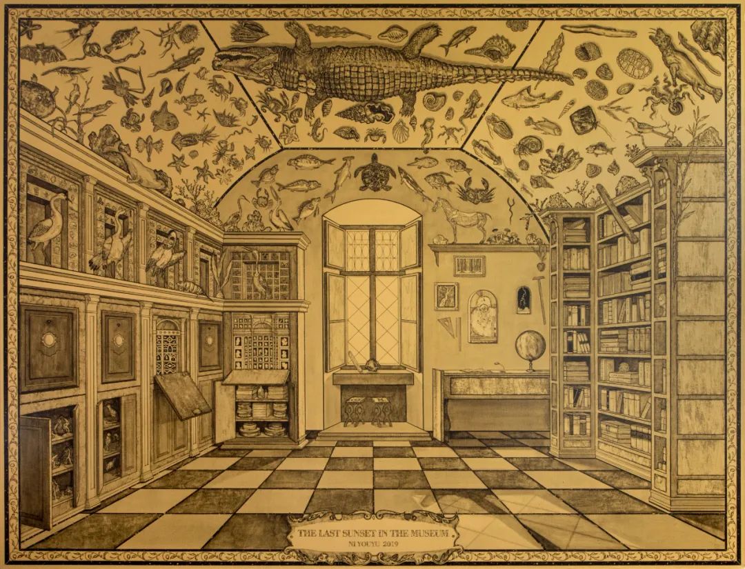 《遗迹》 倪有鱼 布面综合材料 220 × 600 cm 2018 图片由艺术家提供从“拱形”、“尘埃”系列,到“银河计划”,艺术家的创作以不同媒介与创作手法,描绘着一个浩瀚宇宙。他同时刻画大地的意象,一幕幕具象景观透过画布的铺陈和水冲的干预,人为地影响着观众对自然的想象。他又用木材雕出刻度,把时间记录于“寸光阴”;以古董画框,打破与重组人类栖居的空间,迫使观者不断反思绘画艺术在知觉构建上的努力;在《博物馆的余晖》中改写自意大利药剂师费兰特·伊普拉多(Ferrante Imperato)于16世纪编撰的《自然历史》插画,故意隐去人物,巧妙换走架上作品和书籍,叙事背景从画面得到抽离,时空在几百年的流转中不断融汇、交错。