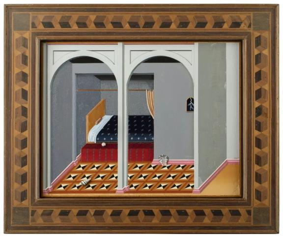 《博物馆的余晖 》 倪有鱼 布面丙烯 260 × 340 cm 2018 -2019 展览现场 ©和美术馆 摄影:刘相利受到约瑟夫·康奈尔(Joseph Cornell),以及在学院教授建筑和机械制图的父亲的影响, 倪有鱼的众多创作都显示出与手工的亲密关系,他甚而会迷恋制作过程所带来的微小的误差感,视之为作品的一部分或新的契机。他欣然认同的艺术范型,往往“发于感性而止于理性”,虽然在挖掘“原本无关的事物之间隐性的逻辑关系”方面,超现实主义带给他重要的启示和乐趣,然而,他一直警惕过于空泛和放任的联想,强调视觉的去欺骗性,“有图像之始就有欺骗”,正是这种思考的训练和作用,使他的作品时而显得像推理小说,严谨、整饬而又耐人寻味。