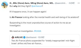 航空从事者@H., BSc (Hons) Aero, MEng (Hons) Aero, MSc:飞行员为何发生争执?如果此类事件发生了一次,就意味着会再次发生。法航是否在关注飞行员的心理健康和待遇福祉问题?对一名调查员来说,停职是最无用的解决方式,我们迫切需要调查。