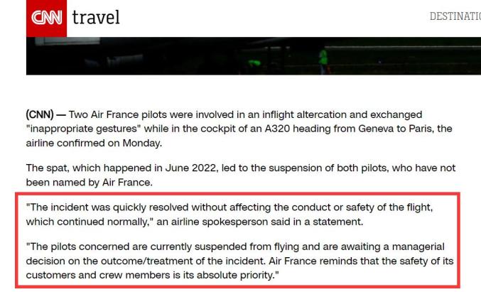 法航确认,2022年6月在执飞日内瓦-巴黎航线的一个航班时,两名驾驶空客A320飞机的飞行员发生争执后,有不适宜的肢体动作发生。该事件很快得到了解决,没有影响到飞行驾驶和安全,航班随后正常进行。法航表示,相关飞行员目前被停飞,等待管理层对事件的结果或处理作出决定。同时航司强调,法航始终将旅客和机组成员的安全置于首位。