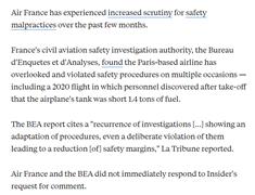 法国民航安全调查分析局表示,鉴于近期关于法航事件的调查一再发生,显示该航司对程序的调整,甚至故意违反这些程序,导致安全系数降低。