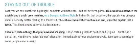 业内网站Mentour Pilot撰文指出:飞行员应避免在飞行中讨论政治、宗教、体育等容易引起分歧的话题,在重要飞行阶段,应避免任何与飞行无关的谈话。此外,航司可以制作花名册,允许飞行员选择不与特定的飞行员共同飞行。