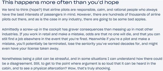 质疑飞行员安全意识淡薄。Onemileatatime称,机组人员纠纷事件发生率较高,驾驶舱内出现失误所导致的后果会比大多数其他行业更加严重。鉴于飞行员工作压力较大,在某些情况下,我们可以理解机组人员发生争执的情况,但在此次事件中,飞行员不顾飞行安全,争执如此激烈,乘客可以在机舱内清楚看见双方争吵互殴的画面,令人十分震惊。
