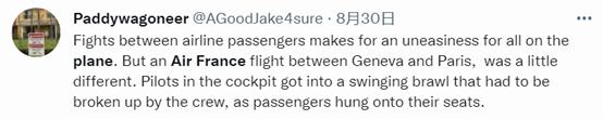 海内外网友观点推特个人账号@Paddywagoneer(粉丝数:3.2万):航班乘客之间的争执会让人感到不安,但此次法国航空有些离谱,驾驶舱内的飞行员竟发生如此激烈的争吵,而机上乘客被“固定”在座位,以至于机组人员不得不将其分散开来。