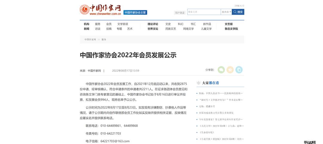 2022年共有2211人符合入会申请条件。中国作协组织专家咨询评议,经投票产生推荐入会名单。8月16日,中国作协书记处同意将名单予以公示,征询社会意见。