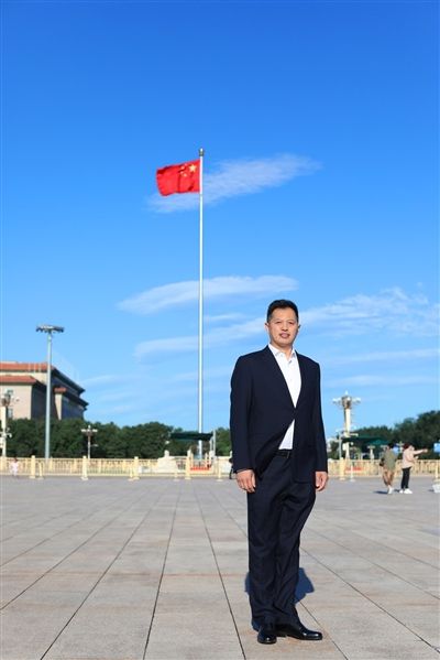 近日,徐宏伟在北京天安门广场上与国旗合影。胡安华摄