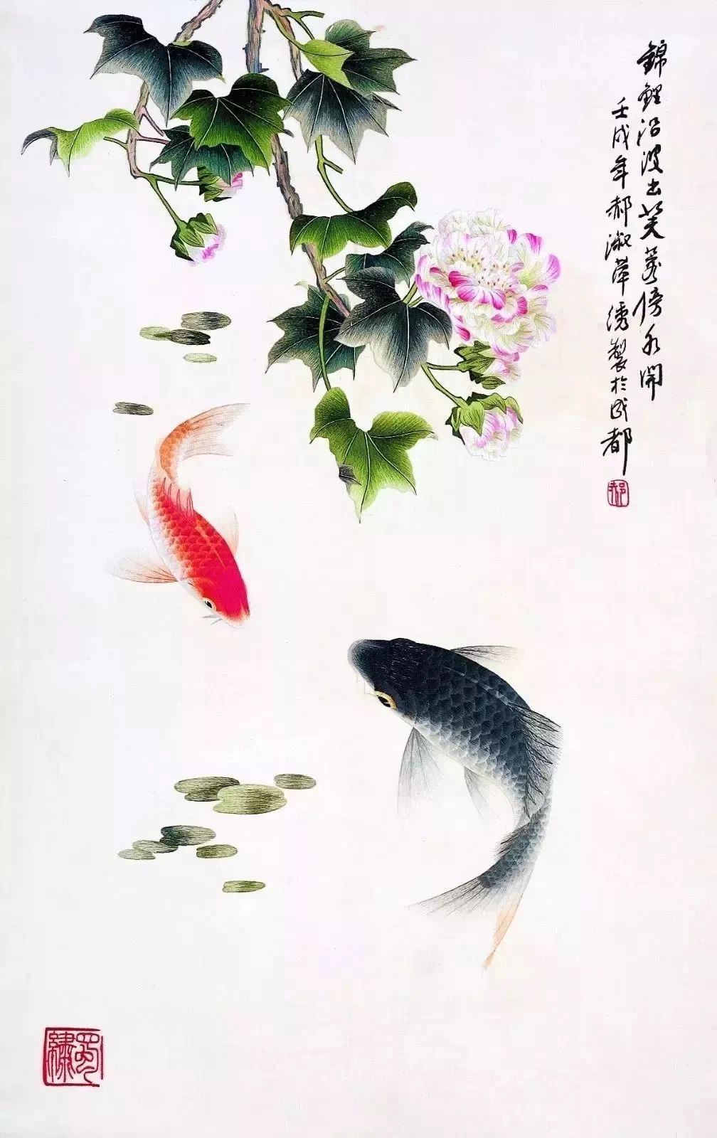 郝淑萍蜀绣作品《芙蓉鲤鱼》 图源/四川非遗把羌绣和蜀绣放在一起,很明显的就能看出蜀绣讲究清丽雅致、和谐含蓄,而羌绣奔放热烈、个性跳脱。