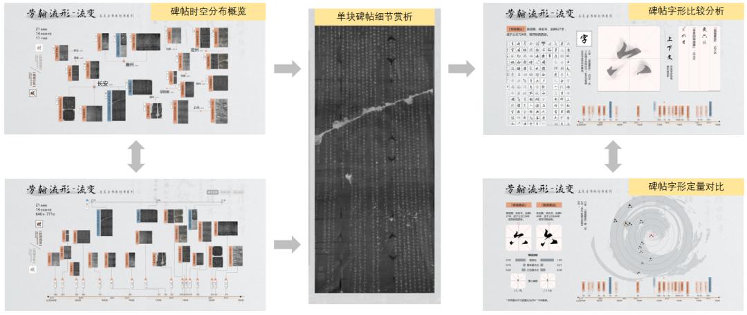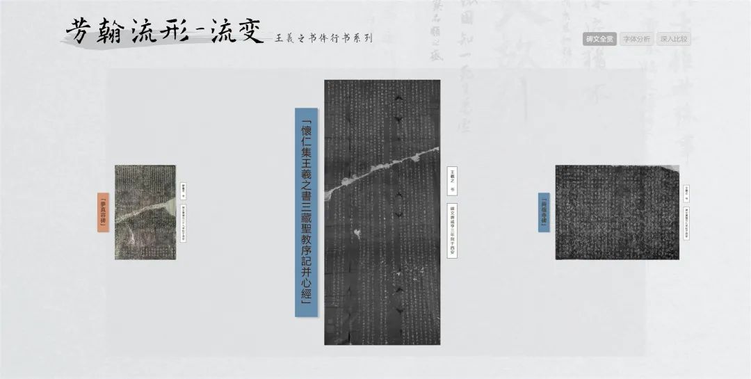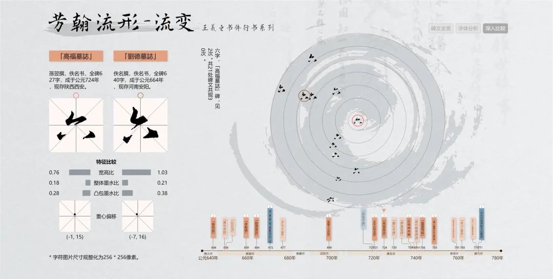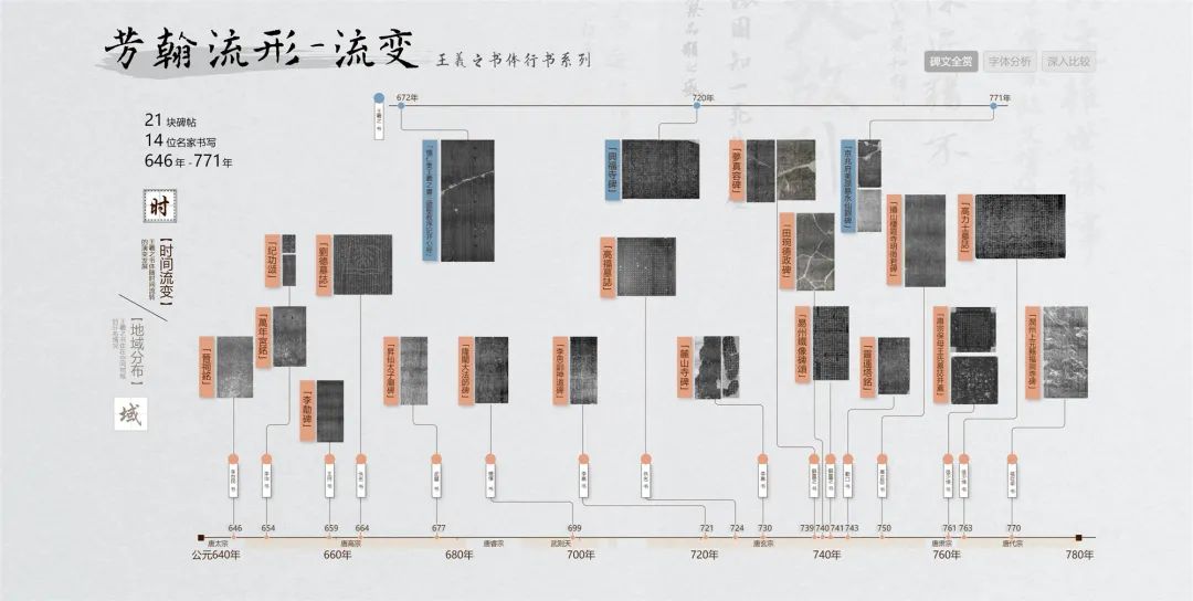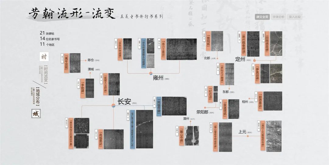 《芳翰流形-流变》基于唐朝时期21件保存至今的王羲之书体行书的碑帖拓本,通过揭示不同碑帖的字体流变及地域分布提供碑文整体赏析,允许交互地选择相同文字的不同字形,从视觉表现和形状特征两个角度深入分析,解读王羲之的行书字体的传承和变化。