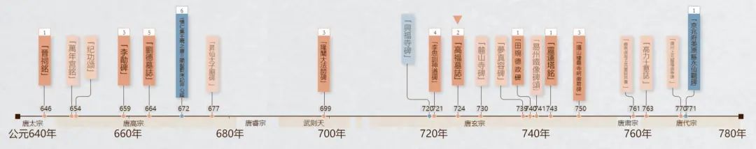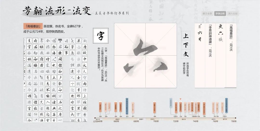 不同碑帖中出现的“六”字对应的上下文时间线视图展示碑帖的时间分布和选中的字在碑帖上的频率分布。整体采用紧凑布局,每个碑帖使用缩略的矩形替代原图,并用曲线与时间轴连接。点击矩形可以选择单个碑帖。