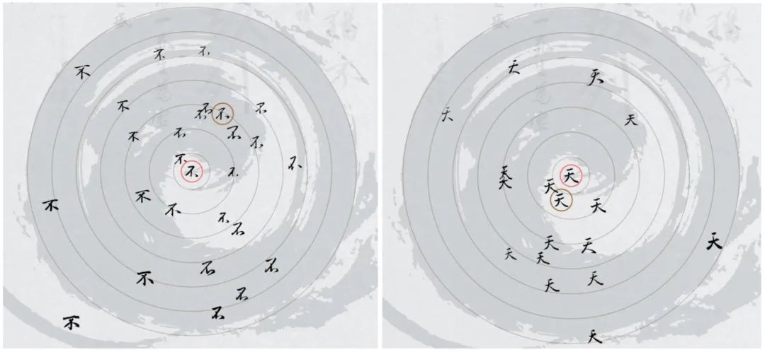 在选定一种碑帖后,系统以字符为切入点来帮助用户进行深入分析,剖析碑帖内部和之间笔法风格和字形变化。通过左侧碑文视图,用户可以方便地选择感兴趣的字,在叠字视图上直观地了解其在结构、布局、笔画等方面的变化。