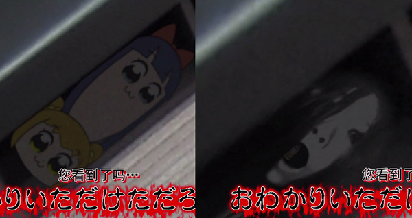 这部动画的神经之处远远没有止步于此。在第二话中,有一个录音棚声优出镜的片段。这片段里面在声优向制片人投诉脚本空白并离开房间之后,画面靠左前方会有一个面向观众的贞子,然后诡异的音乐配上血红色的字幕: