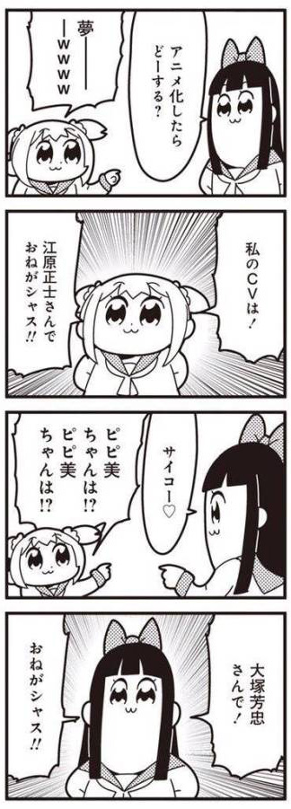 早在2017年4月1日,竹书房就曾经宣布会将有大川ぶくぶ的《星色Girl Drop》动画化,而且还特地为了这次动画化制作了一个40秒的宣传片。不过第二天Pop子撕破《星色Girl Drop》的宣传页面,显露出真身。这也证明了《星色Girl Drop》动画化只是一个愚人节的玩笑,真正动画化的是这一部《Pop子与Pipi美的日常》。