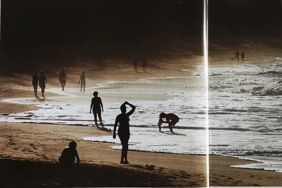 【学习笔记】逆光拍摄呈现了一幅几乎是单色效果的沙滩照,傍晚的阳光让阴影与高光部分都带上了一层暖色调。长焦镜头同时压缩了透视。(2005年)