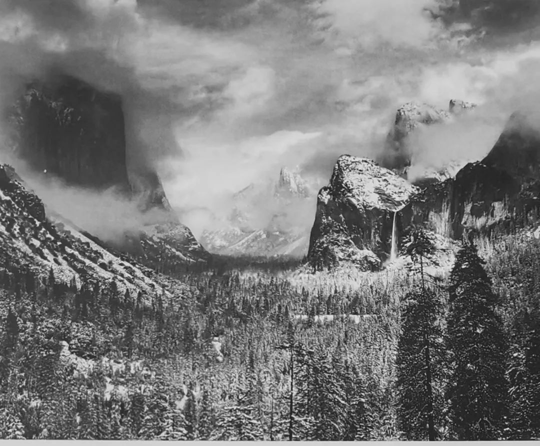 【学习笔记】在这幅作品中,安赛尔•亚当斯在暴风雪结束后立即开始拍摄,确保山上有薄薄的一层雪凸显出画面中的地形地貌,照片引领着观看者的目光进入山谷,利用前景中的暗处引导观看者关注画面中央被太阳照亮的部分,特色是注意到阳光照射下瀑布所形成的纵向线条。负片获得了完美的曝光,捕捉到了从黑色到白色,以及不同灰度的影调细节。(1937年)
