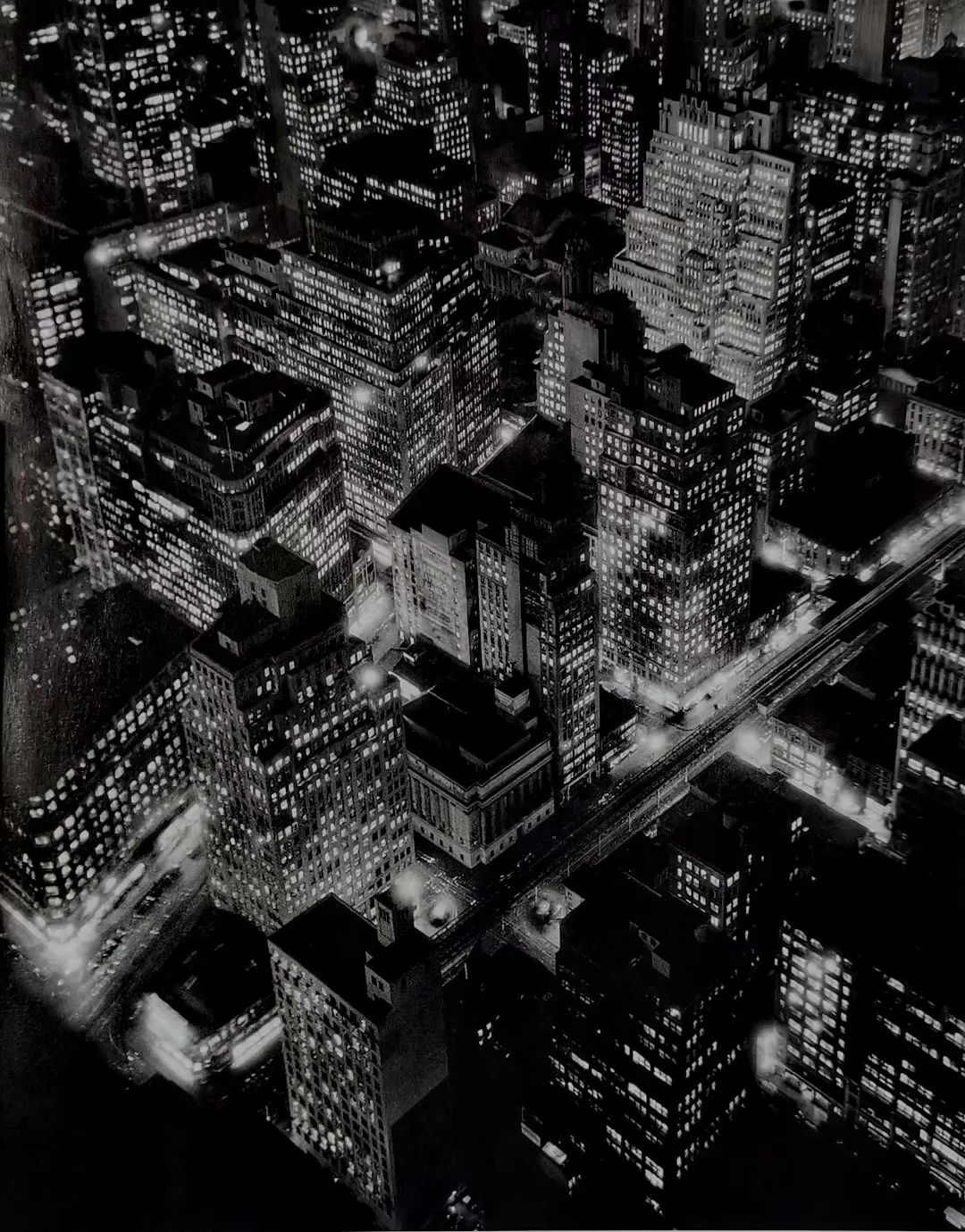 【学习笔记】美国女摄影师贝雷妮丝•阿博特使用一台8吋x10吋的格莱弗弗莱克斯牌世纪通用型大画幅相机拍摄了这幅照片。照片捕捉到了丰富多彩的大都市所蕴含的能量,即便是在今天来看,也依然鲜活生动。阿博特非常谨慎地策划了这幅照片的拍摄,她深知道留给她拍摄的时间很短暂,只有等街道足够黑而建筑上的灯还亮着的时刻才能拍照。而为了找到最佳拍摄位置,她还必须通过协商获得登上摩天大楼顶层的许可。对于风景和建筑摄影来说,对光线和机位的精细策划是拍出好照片的关键。(1932年)
