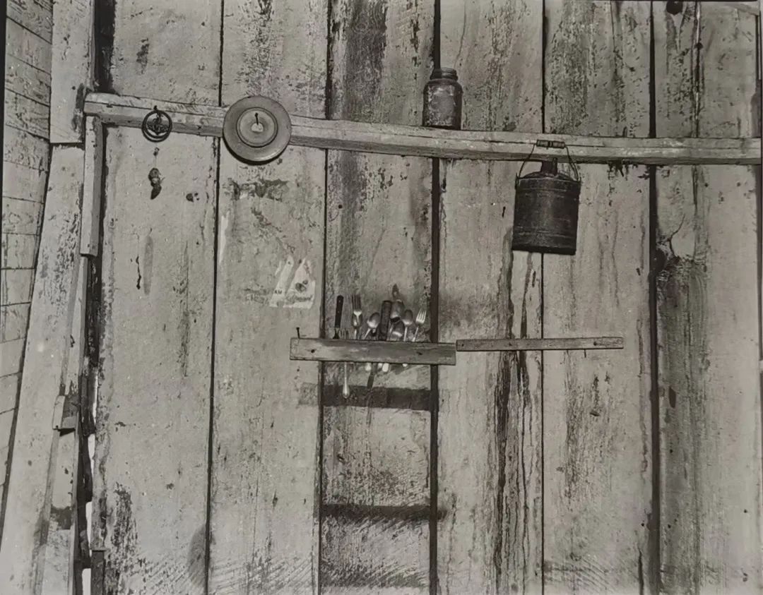 【学习笔记】美国摄影师沃克•埃文斯拍摄的这幅描绘佃农家庭室内墙面的照片,集中体现了摄影师从民间建筑中找到视觉诗意的能力。照片从正面拍摄,第一眼看上去构图十分简单、刻板,几乎是平面化的。深入观察后会发现构图是由复杂的线条、形状和结构组组合而成,让人想起立体主义或抽象表现主义的艺术做品。简单摆放的几件餐具,就好像是给生活中十分重要的事物所搭设的神圣祭坛。整体造型拟人化,看上去很像一张脸,盘子是眼睛,刀叉是嘴。餐具后面的墙体表面有着更深的色调。拿走、放回这两个动作不断重复,磨掉了墙体的漆面,留下了家庭成员手上的油渍和污垢,灰色调的微妙变化揭示了眼前看到的只是一时的画面,表明这家人己经上百次地使用了这些悬挂的餐具。我们可以明显觉察到时间的流逝感,觉察到在拍摄这幅照片之前画面是如何存在的,拍过之后又如何继续。这些简单的物品代表了佃农生活无声的尊严,时间就从这些物品中流动了出来。照片将日常的瞬间与场景升格,赞颂了平凡生活的诗意,激发观者进行门回应,让他们看到更深层次的内涵。(1936年)