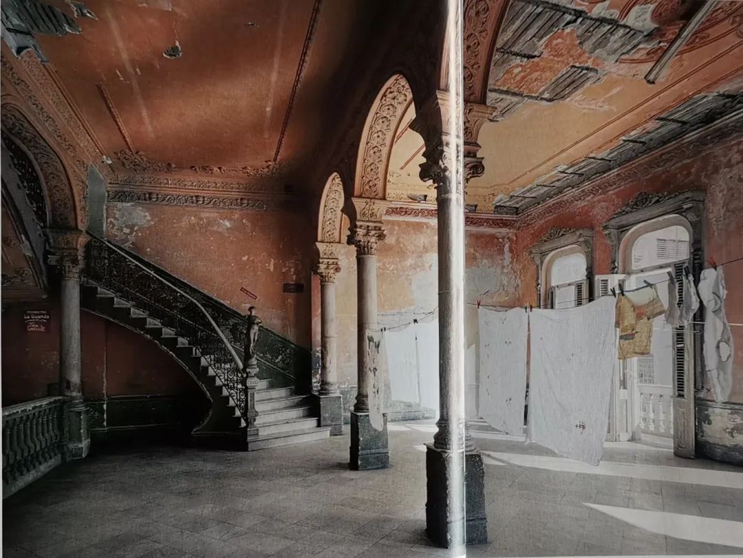 【学习笔记】加拿大摄影师罗伯特•波利多里的这幅照片选自在哈瓦那拍摄的系利照片。他探索了古巴首都哈瓦那正在消失的光辉,赶在这里尚未完全衰落或被国际投资者们实施现代改造之前拍下了这一幅照片。这幅照片蕴含着强有力的视觉引导,它邀请观看者走进场景之中,然后选择向左上楼或者向右去露台看看外面的世界。在构图上重复使用强有力的垂直线和对角线,带领观看者的目光看遍四周,色彩搭配和谐,在从窗户照进来的柔和光线中,画面融为一体。褐色的涂料、破败的下沿、掉落了灰泥的天花板等等,这些细节突出了时间的流逝和这个曾经繁华的场所的衰落。从这个门厅可以进入哈瓦那数一数二的由政府经营的私人餐厅,这暗示了自由市场经济所带来的影响。波利多里拍摄的照片锐度极高,色调丰富且饱含细节,这对如何展示场景十分关键,他认为:“如果照片很柔和,那么它只能唤起情感,或者留存在你的想像中。你感受到一种情绪,但只能停留在情感的层面。……如果画面中细节更丰富一些,就像那句老话说的,没有什么小说能比现实更荒诞。现实会将最相悖、最矛盾、最相近的东西放在一起,令人无法理解。”(1997年)