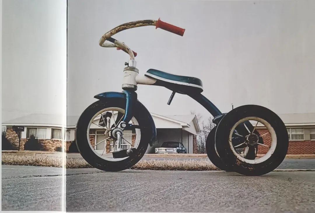 【学习笔记】美国摄影师威廉•埃格尔斯顿拍摄从低角度拍摄的这辆童车显得十分雄伟壮观,很像一尊雕塑。画面的主色是美国国旗的红、白、蓝三色,三轮车上斑驳的铁锈可能在暗示美国正逐渐消逝的荣光,背后是典型的效区街道,但三轮车前后轮之间的汽车增添了一些生气,好像正打算开出来碾轧这个玩具。埃格尔斯顿的作品第一眼看上去会令人觉得有些过于简单,但当你仔细审视他的作品,就会发现那些重复出现的形式元素与主题绝不是偶然为之。(1970年)