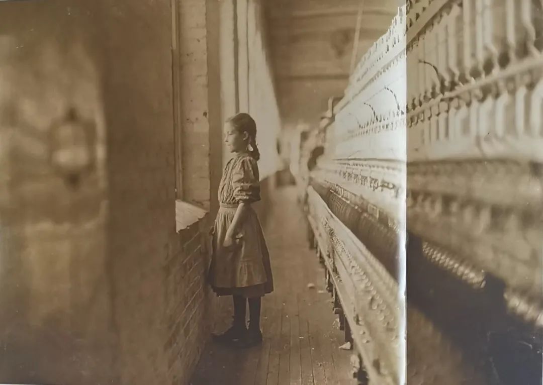 【学习笔记】美国摄影师刘易斯•海因把相机作为社会改革的工具,并专门为了童工的权利而四处奔波。他认为:“社会工作者的格言就是“要有光”,在这场为了光明的运动之中,我们的先遣队就是——摄影”。在这幅照片中他使用墙壁表面的线条和图案与纺织机器去衬托孩子,孩子贪婪地凝视着窗外,这表明她对工厂外面美好生活的向往。(1908年)