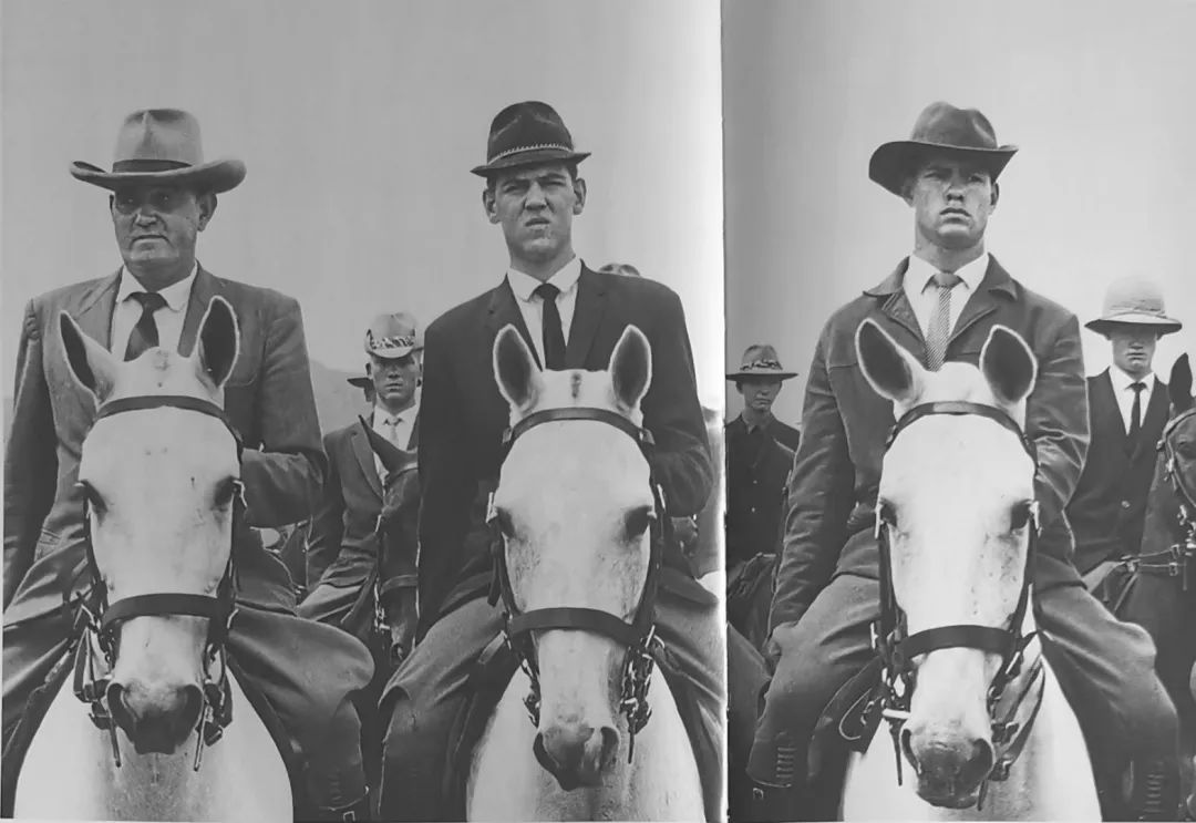 【学习笔记】:南非摄影师大卫•戈饶布拉特倾注他的全部摄影生命记录了南非社会的紧张局势,包括白人统治年代和后种族隔离时代。这幅照片来自他在20世纪60年代为那时统治南非的白人拍摄的一个系列作品。它探讨了如何通过脸、服装和举止来体现种族的价值。衣服的重复和殖民时期帽子的微妙变化,给人的感觉就像是一个准军事单位,而白马的脸反映出南非白人对权力和地位的信仰。(1964年)