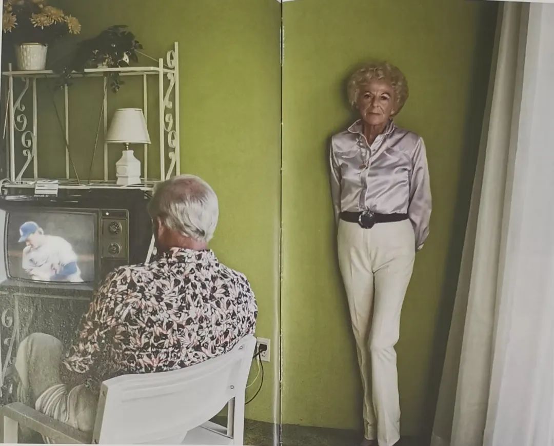 【学习笔记】:美国摄影师拉里•萨尔坦是一位观念摄影师,他通常在日常状态下工作,拍摄高度情绪化和具有心理影响的照片,在此状态下感知身体语言、姿态等细节以及一个场景中最微未的细节。拉里在他的摄影创作中十分有条理,列出拍摄计划,而不是简单地期望精彩图像会自发出现。他的摄影以家庭为主题,这幅照片看似简单,但事实上无论是在内容和意义上,还是在组成元素上,这幅照片都非常复杂并内涵丰富,电视屏幕上棒球选手的头和母亲的竖直站姿形成了一个三角形,赋予照片一个强有力的内部结构,这个结构让观众的目光无情地穿越父亲的光头,集中到画面中的关键要素。画面的色彩和谐,同服装的纹理和图案一起,代表了美国的一个特定社会阶层。他说:“直正去摄影才是我所希望的,我希望时间停止,希望我的父母永远活着。(1992年)