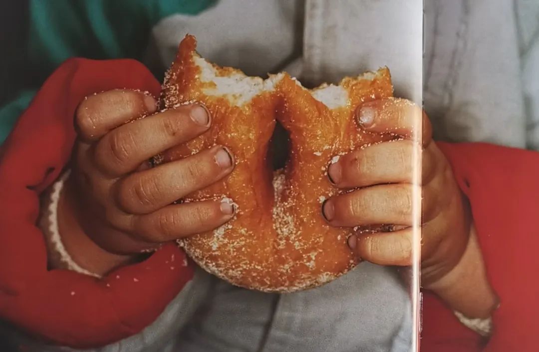 【学习笔记】英国摄影师马丁•帕尔的这幅照片选自《常识》系列,他运用闪光灯和业务胶片给照片带来极其饱和的色彩,增强了画面的莽撞感。每一个细节都被清晰呈现,小孩子指甲缝里的污垢和白色的糖霜形成了鲜明的对比。画面的色彩简单但富有冲击力,蓝色的衣服提供了协调的背景,圆鼓鼓的红色袖子从背景中跳出来,与甜甜圈的形状相呼应。(1996年)