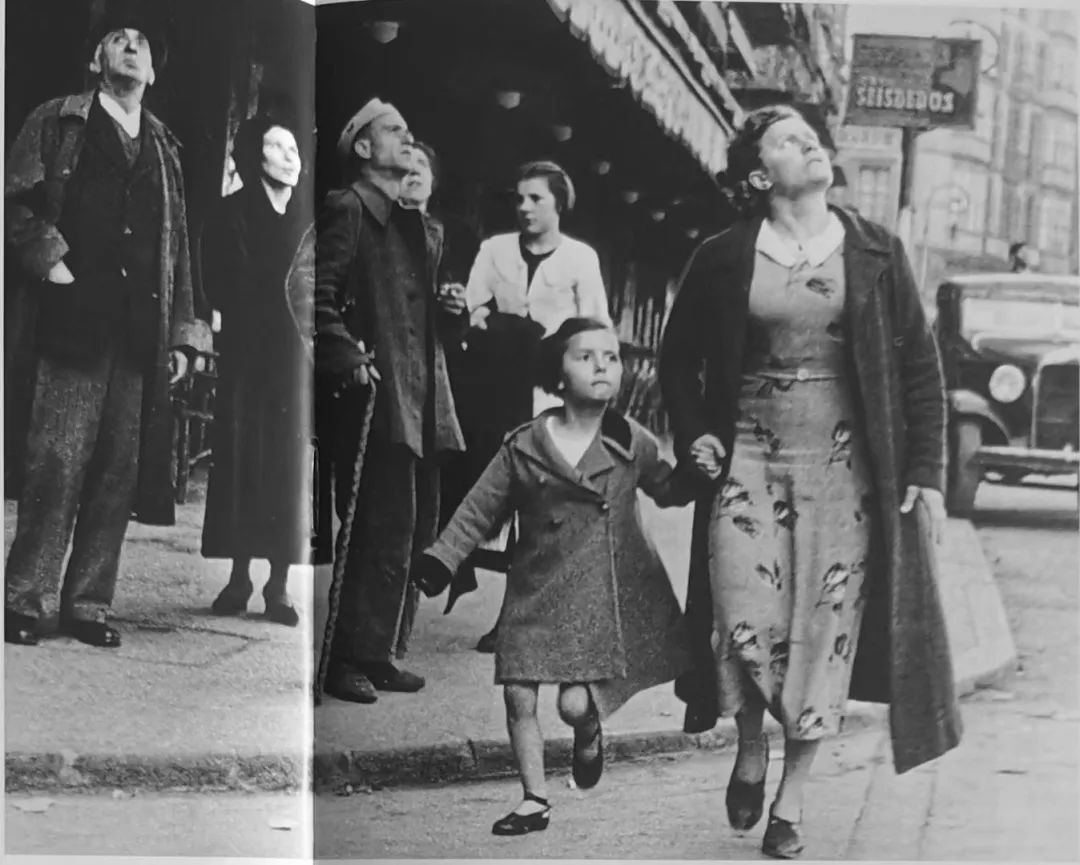 【学习笔记】:匈牙利摄影师罗伯特•卡帕原名安德烈•弗里德曼,为了让自己的著作能够顺利出版,他和他的女朋友格尔达•塔罗编造了“伟大的美国摄影师罗伯特•卡帕”这个名字。1944年,他在法国拍摄了表现诺曼底登陆的历史性照片。战后,他与人联合创办了马格南图片社。此后,他又回到战场,于1954年在印度支那触雷身亡。1936年至1939年期间,罗伯特•卡帕对西班牙内站进行了大量的报道,他对前线战事的报道生动而富有时效性,是当时十分罕见的新闻报道方式。这幅强有力的照描绘了巴斯克城市毕尔巴鄂的街道上人们惊慌的场景,他在那种情况下仍能敏锐发现细节的眼睛聚焦到了一个把外套扣子系错了的急冲冲跑向防空洞的小女孩身上。(1937年)
