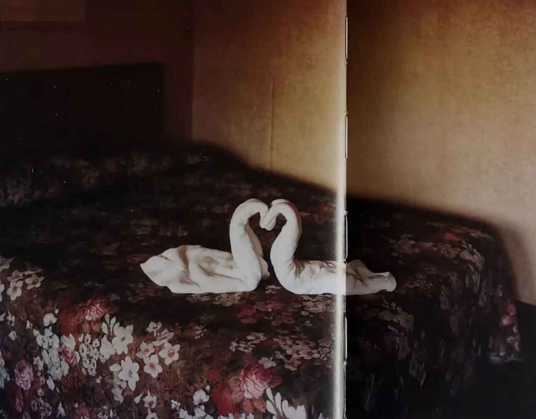 【学习笔记】美国摄影师亚历克•素思拍摄的这幅照片《两条毛巾》是《尼亚加拉》一书的封面。这两条毛巾被折叠成了一对天鹅爱侣,相互温柔地亲吻。毛巾上轻微的褶皱给画面增添了一丝忧伤的气氛和深沉的情感。花朵纹的床单强调了我们与自然之间的关系,但也是对连锁酒店常见的沉闷内部装饰的讽刺。从窗口照进来的柔合光线凸显了毛巾的白色,让它们在深色调的房间里熠熠生辉。对于刚刚从事摄影的人,索思有一点忠告:不要太早期待成功,让自己的作品在没有外界压力的情况下逐渐进步十分重要。(2004年)