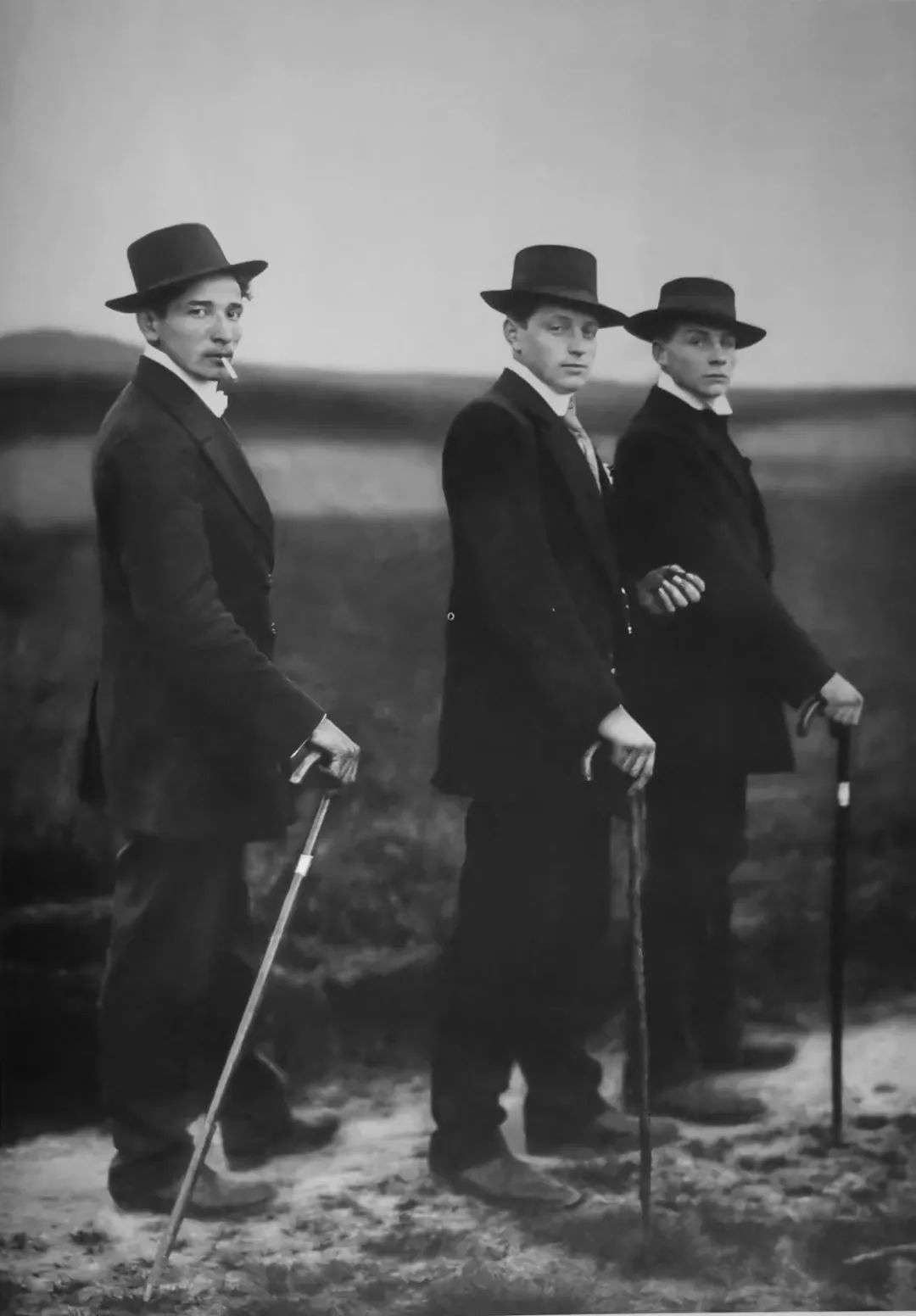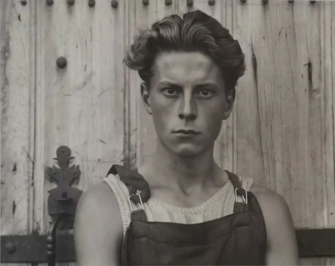【学习笔记】德国摄影师奥古斯特•桑德是摄影史上最重要的的人像摄影家之一。他的摄影观点是:“人是由光、空气、遗传特征和动作组成的。我们能从外表分辨出一个人所从事的工作,我们能从一个人的面部表情判断出他是开心还是忧愁。”因此,欣赏他的照片时,我们很难不去思考德国历史,并想像画面中的人在当时所扮演的角色。画面中的三个男人实际上并不是农民,而是在煤矿工作的工人,他们在去跳舞的路上遇到了桑德,应邀当他们的模特。他们不太合身的西装、手杖、帽子和泥泞的乡间小路所构成的不协调景象,凸显了农村的城市化进程。相同的站姿和着装,让三个人成为一个整体,但帽子的戴法、手杖倾斜的角度和眼神又彰显出每个人的个性。(1914年)