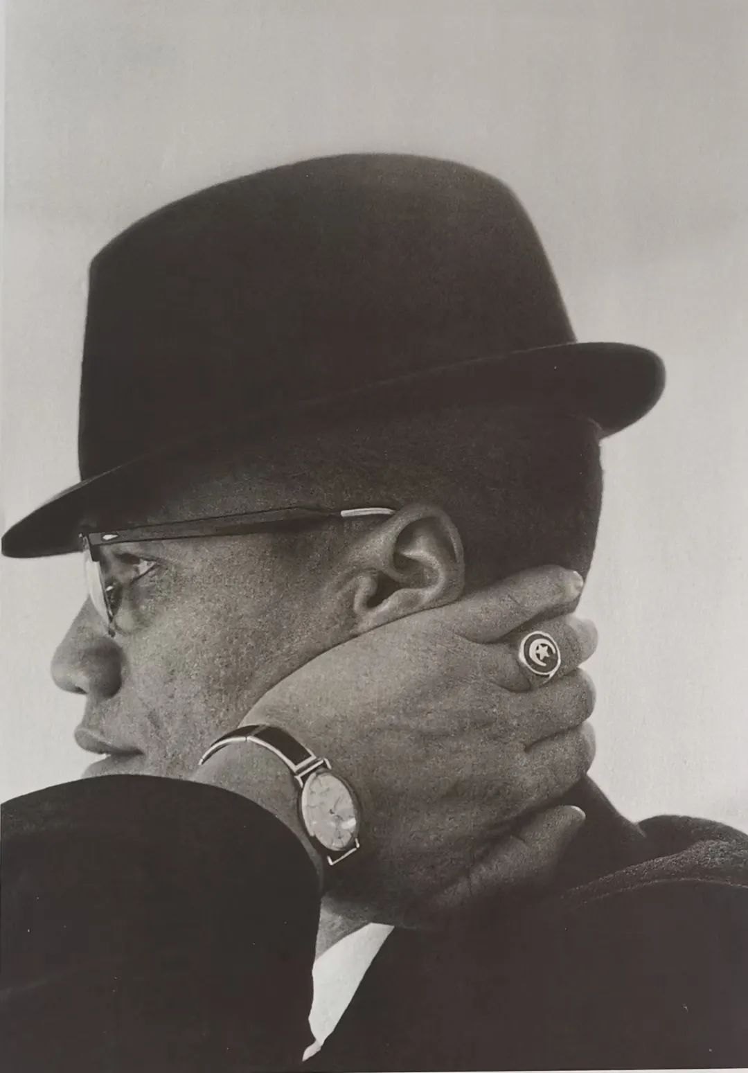 【学习笔记】在美国摄影师伊芙•阿诺德的这幅照片中,被摄对象偏离画面中心,画面构图带领视线从左下角沿着手的方向移动,在戒指处停留,然后再利用眼镜腿线条将视线引导至人物眼睛。偏离中心的构图使得阿诺德能够切掉帽子的一小部分边缘,与整体构图相呼应,并让观看者的目光重新回到马尔科姆•X的侧面轮廓上,接着再回到他的眼睛。如果帽子没有挨到画面的边缘,观看者就会随着马尔科姆•X的目光将视线游移到画面之外。(1962年)
