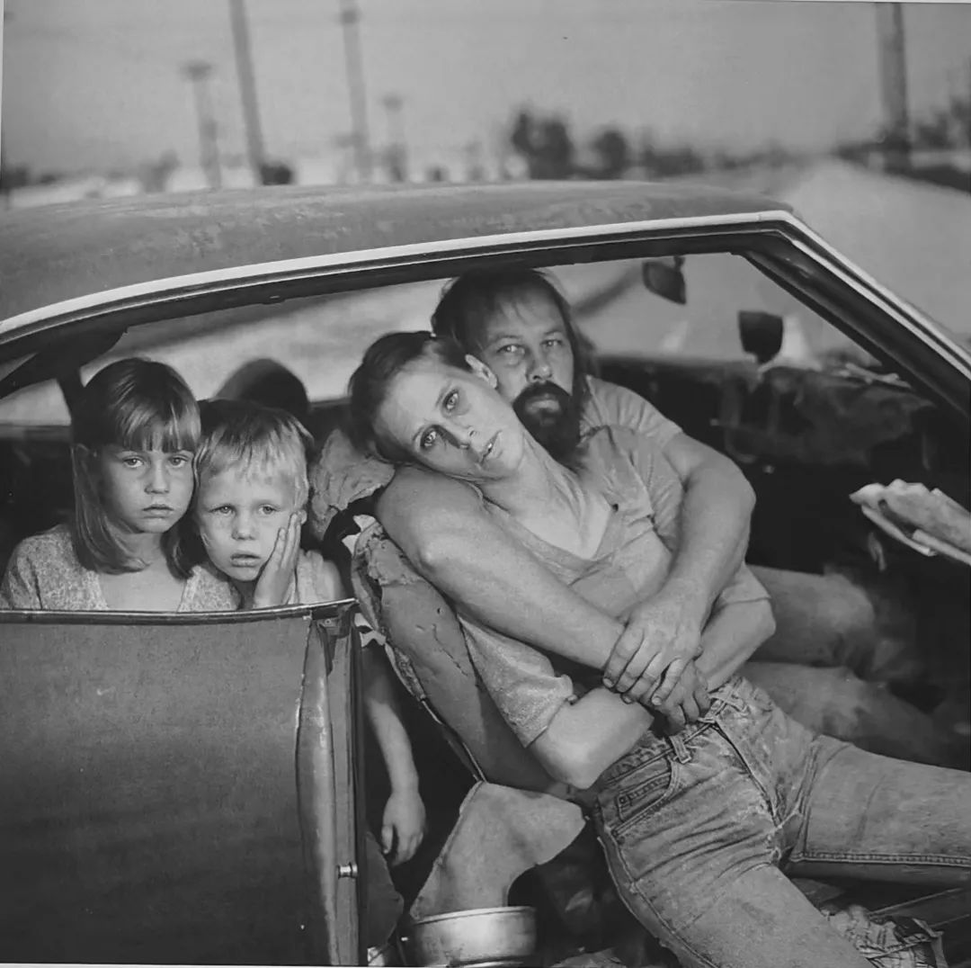 【学习笔记】美国摄影师玛丽•艾伦•马克拍摄这幅震撼人心的人像摄影作品是她在为《生活》杂志工作期间拍摄的。画面中一对夫妻温柔地相拥在一起,孩子们看向车外,眼神中流露出对不确定的未来的担忧。这家人的临时住所就是这辆轿车,没有引擎盖,在驾驶座一侧没有窗户,座椅上的大部分坐垫装饰都不见了,车里有难闻的味道,被一只叫伦尼的斗牛犬破坏的一团糟,在大部分时间里,狗都被拴在副驾驶座的头枕上。伦尼是一种身份的象征,一种潜在的武器,一个可爱的对象,也是某种形式的证明。(1987年)