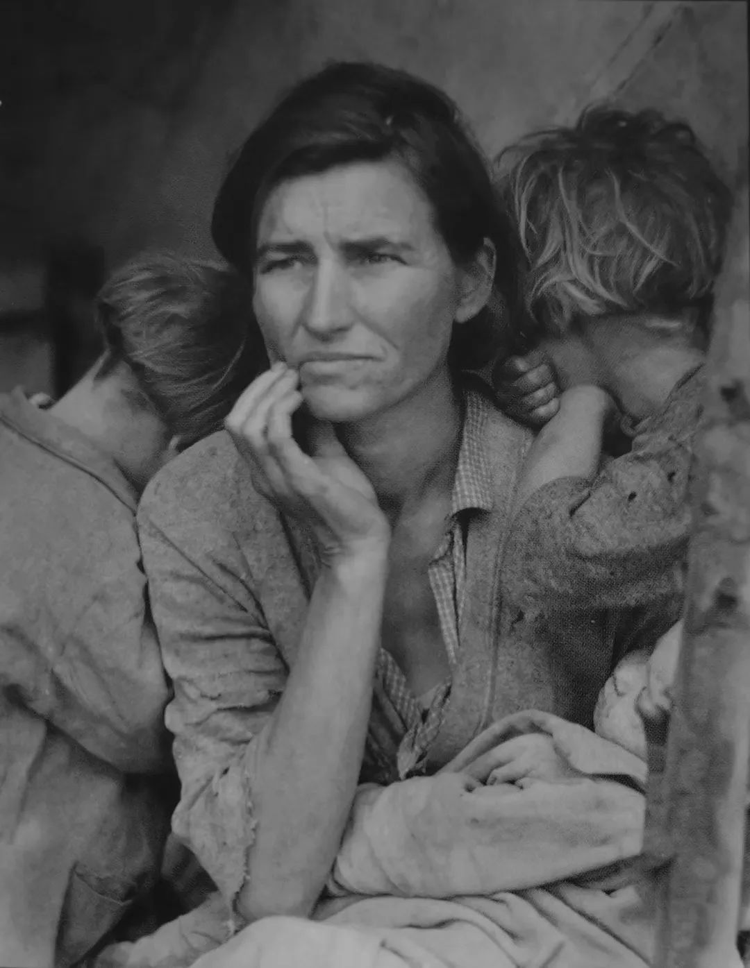 【学习笔记】美国摄影师多萝西娅•兰格经历了悲惨的童年,7岁时罹患小儿麻痹症导致终身残疾;12岁时父亲抛弃了家庭,这些经历使她更加坚强。她拿起相机后,常常和人们席地而坐,任小朋友们研究相机,允许小朋友们用脏兮兮的小手在相机上摸来摸去,也允许他们用手指截相机镜头。兰格拍摄时,喜欢从远处取景,然后越走越近,构图也越来越紧凑。拍摄这幅作品时,她在画画中只保留了女主人的脸以及躲起来的孩子们,并将整幅照片的情感全部集中在母亲哀伤的表情中。兰格认为:“只有当你静下心来,从不断冲击我们生活的、习惯于停留在快速打印中的恼人群体中脱离出来,仔细审视一个安静的画面……才能在观看中有所收获……观看者才愿意停下来,反复欣赏、思考”。(1936年)