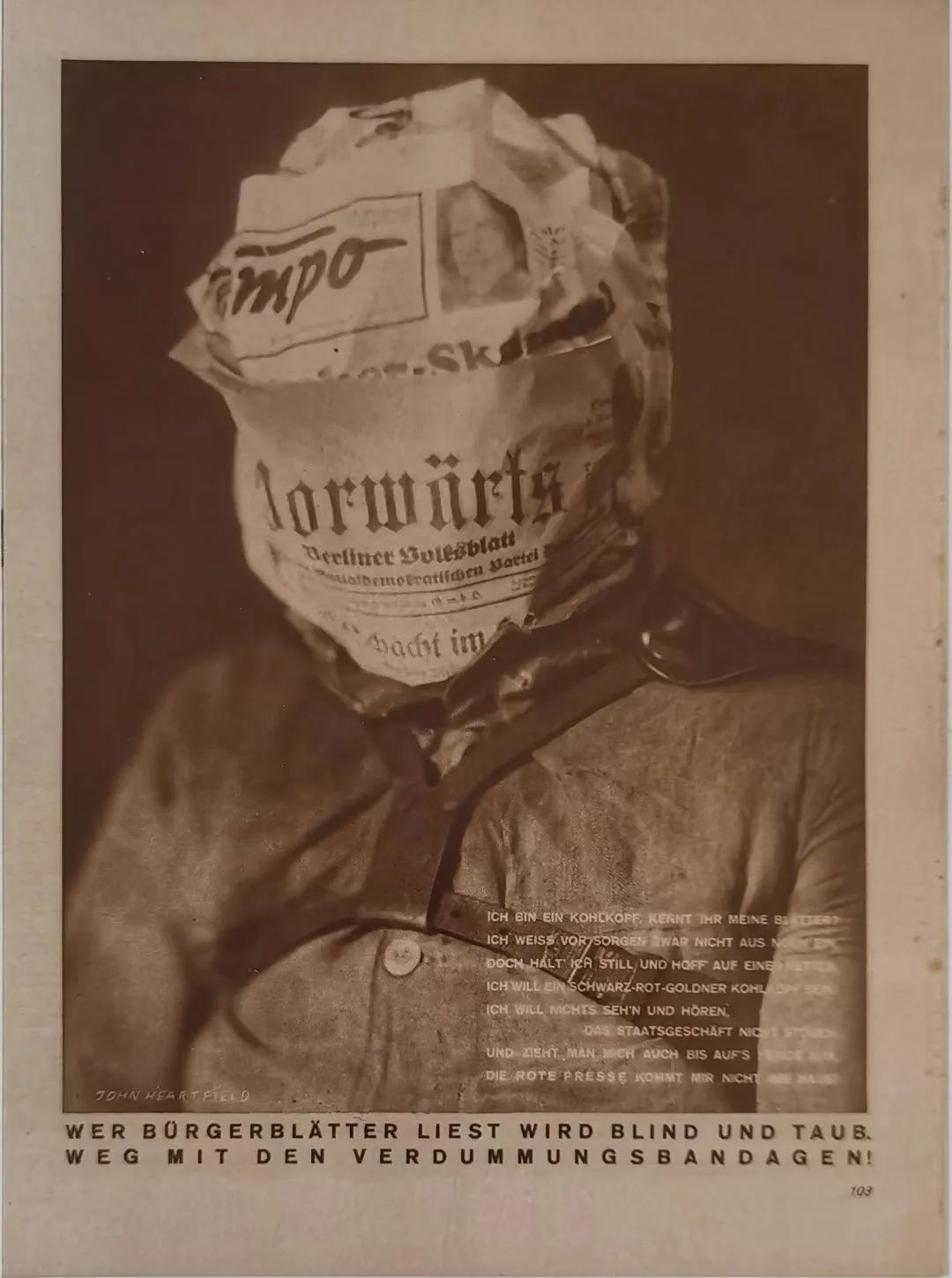 【学习笔记】德国摄影师约翰•哈特菲尔德是最具智慧和讽刺意味的蒙太奇艺术摄影大师,他是一个完美主义者。总会工作到截稿的最后一刻。这幅夺人眼球的照片标志着约翰•哈特菲尔德与《劳动者图片报》(简称AlZ)合作的开始,还经历了时间的考验。这幅摄影蒙太奇作品直接针对对手出版物《前进》(Foward)和《节奏》(Tempo)。图中暗示了这两个出版物在关于现状方面提供错误信息并且误导读者。哈特菲尔德很善于使用语言和文字,画面中本该是嘴巴和眼睛的部位,被报纸的大标题所取代,Tempo一词中的“o”延伸出的笔画看起来很像一根眉毛。对他而言,语言和文字不再只是视觉装置,而是能够传递意义。他创作这幅摄影蒙太奇的原因是:我同时在报纸上的照片中可以看到已经说明了的,和没有说明的事情……只要放上错误标题或者图注,就能撒谎或者讲实话,基本都是这样操作的。”哈特菲尔德的这幅作品也呼应了战后的敏感情绪,当时的德国社会依然停留在战争的伤痛之中,被报纸“绷带”缠满的脑袋预示着对那些伤亡人员的追忆。(1930年)