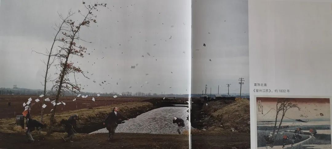 【学习笔记】加拿大摄影师杰夫•沃尔的这幅照片《骤起的风(致敬葛饰北斋)》是他最著名的作品之一,模仿了19世纪日本画家葛饰北斋创作的本版画(右侧)。这幅照片充满了动态与戏剧性的场面,在风中,树干被吹得歪斜,人们正努力抓住漫天飞舞的纸片。这一幕看上去极为真实,但事实上这幅照片是摄影师花费两年时间,运用数码手段将超过一百幅照片中的元素组合在一起而完成的大型蒙太奇作品。(1993年)