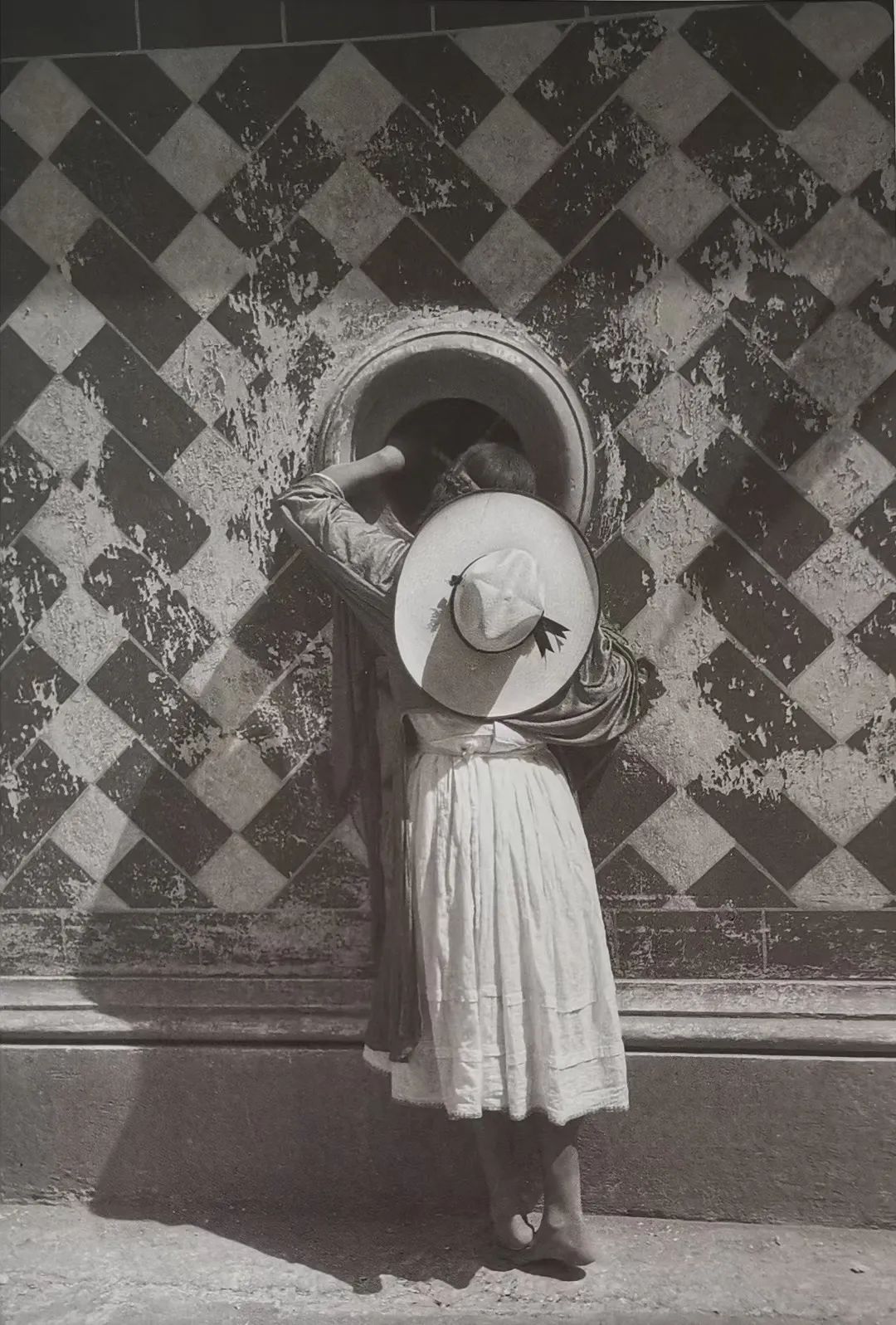 【学习笔记】墨西哥摄影师曼努埃尔•阿尔瓦雷斯•布拉沃拍摄的这幅令人难忘的照片中,一个女孩正在透过墙上一个像深深的眼窝一样的孔洞里往里观看,就好像她可以丢掉天真无邪,穿越到另一个世界一样。她的右脚与踩在上面的左脚保持平衡,把自己微微抬起,这表明她想看到更多,但也令人联想到古典雕像的姿势,她的衣服和帽子代表了墨西哥农民和传统的生活,受到了黑色的孔洞后另一边可能的现代性的挑战。这幅作品是布拉沃化平凡为魔力的代表作,诠释了他对欧洲超现实主义的憧憬。他说:“拍摄你所看到的,而不是你所想到的。……拍摄照片时,你是不会想去说些什么特别的……而是去营造某种视觉上的东西,这种东西会是有摄像者并未打算去传递的某种含义——这取决于观众的解读,摄影者不必要去作解释。”(1933年)