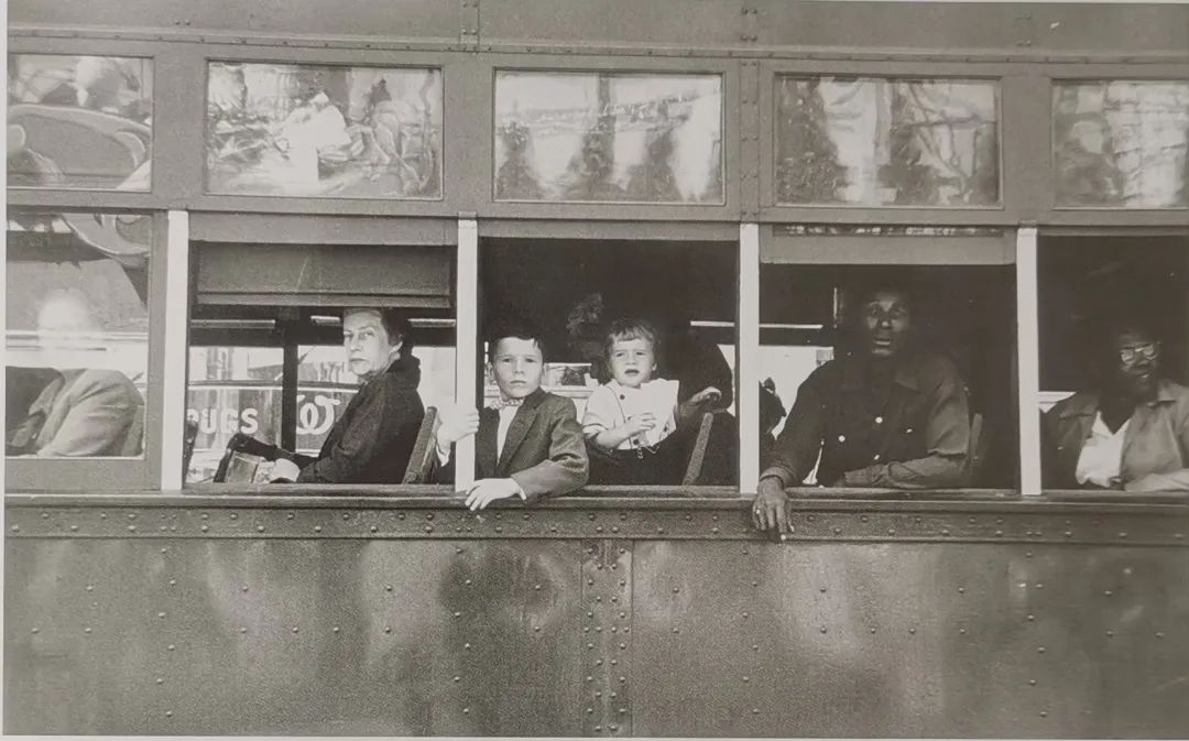 【学习笔记】美国摄影师罗伯特•弗兰克拍摄的这幅照片是在新奥尔良每天都能看到的场景,反映了美国南部种族问题的复杂牲。无轨电车的车窗将人们分隔开,每一个车窗中的人都代表了一种典型的美国社会阶层:从正用严厉而不屑的目光注视着摄影师的中产阶级妇女,到典型的黑人女佣以及诚实可靠的“汤姆叔叔”型工人的非洲裔美国人。在正中间,打领结的小男孩象征着巨大的贫富差距。在丰富的含义之外,画面形态也因金属、皮肤和玻璃的不同质感而显得复杂多样。画面中的电车成为一个二维的平面,立体的人物从这个平面上突显出来。沿画框的顶部扇扇窗户的反光,像是能够自动进带的电影胶片,已经有些模糊的电影剧照正讲述着自身的故事。(1955年)
