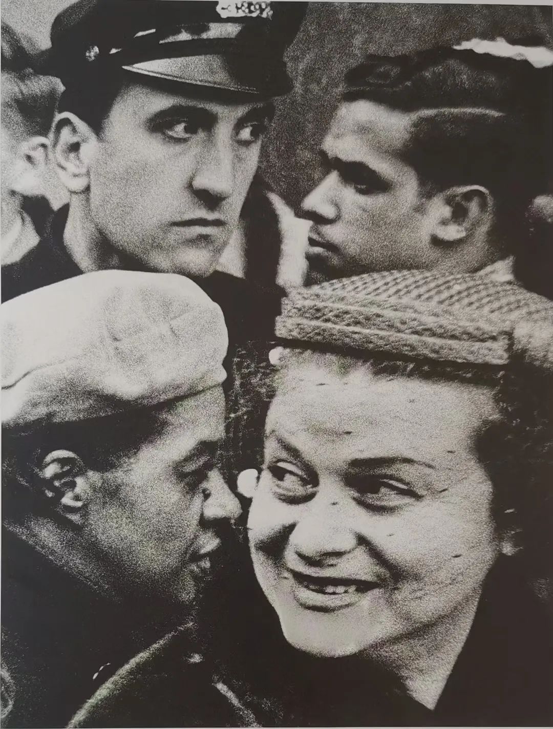 【学习笔记】美国摄影师威廉•克莱因拍摄的这幅构图密集的照片是1956年出版的纽约市影集的开篇,画面中四位被摄对象的面部在边缘处被拉伸,充分呈现了他用广角镜头无限接近拍摄对象的标志性手法。他将这座城市的多元文化生活捕捉在了一个画框中,一场感恩节游行让不同的种族和类型的人们在街角机缘巧合地组成了一个整体。克莱因自学成才,抵触专业摄影所设定的条条框框,倾向于更加松弛,凭借直觉的拍摄手法。因此他自成一派,找到了更加适合城市喧嚣的创作风格。(1955年)