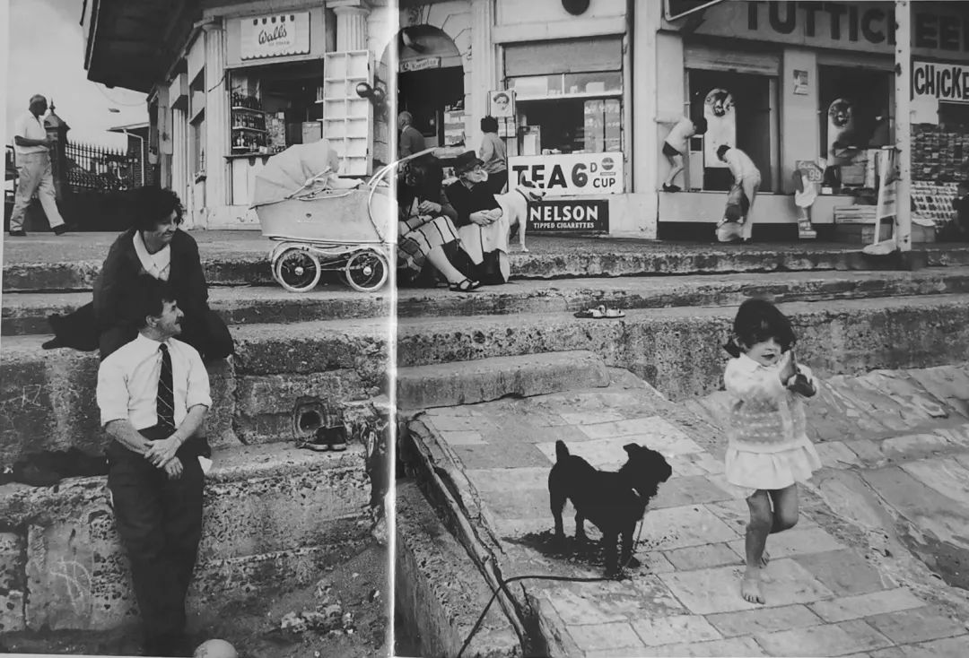 【学习笔记】英国摄影师托尼•雷-琼斯的这幅照片拍摄于肯特郡一个海边小镇的沙滩,展现了他对拍摄那一瞬间的场景编排的卓越掌控能力,他首先尝试竖着拍照,然后又横着拍,将穿白衬衫系领带的男士放在画面左下角。接着缓缓移动镜头,等待画面在自己眼前逐渐展开,直到小女孩从斜坡上跳下,而她周围的人却毫无察觉。照片可以按照构图被分割为几个部分,每一个部门都能独立构成一幅画面:画面右上角的小孩正在拉窗帘;有一对推着婴儿车的情侣;有一位男性从左侧走入画面。即便将影像中的某些部分遮住,剩下的部分也依然十分有趣。画面中的文字和街道设施是整个叙述中非常重要的元素,而画面中的小细节同样对整体叙事有帮助:被丢在一边的凉鞋代表在小女孩跳下的方向有一片沙滩,而斜坡上的小狗看上去是被它身下的一团不明的黑色污渍弄脏的。(1967年)