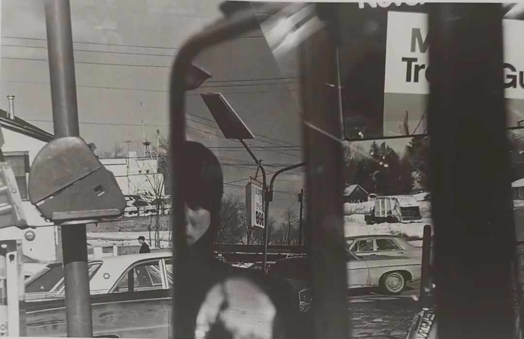 【学习笔记】美国摄影师李•弗里德兰德对相机如何捕捉前面的景物,渲染出现在镜头前每一个平凡元素的能力非常着迷。这幅照片是他在探索如何利用屏幕或者反射面,比如窗户和汽车的后视镜,来将影像的平面碎片化,利用垂直和水平元素,比如电线杆和灯柱,来划分画面。这幅照片好像一个视觉的拼图玩具,在天空、树木、电线和街道设施中相同的元素到处重复,有些在镜头前有些有镜头后,然而它们组合在一起构成了一个无缝的世界。他经常把自己拍到画面里,一只眼睛盯着镜头,另一只眼睛自由地观察场景。(1970年)